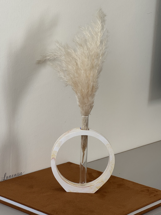 Kahve-Sarı Mermer Desenli Daire Form Cam Tüplü Vazo Minimal Kuru/Islak Çiçek Vazosu