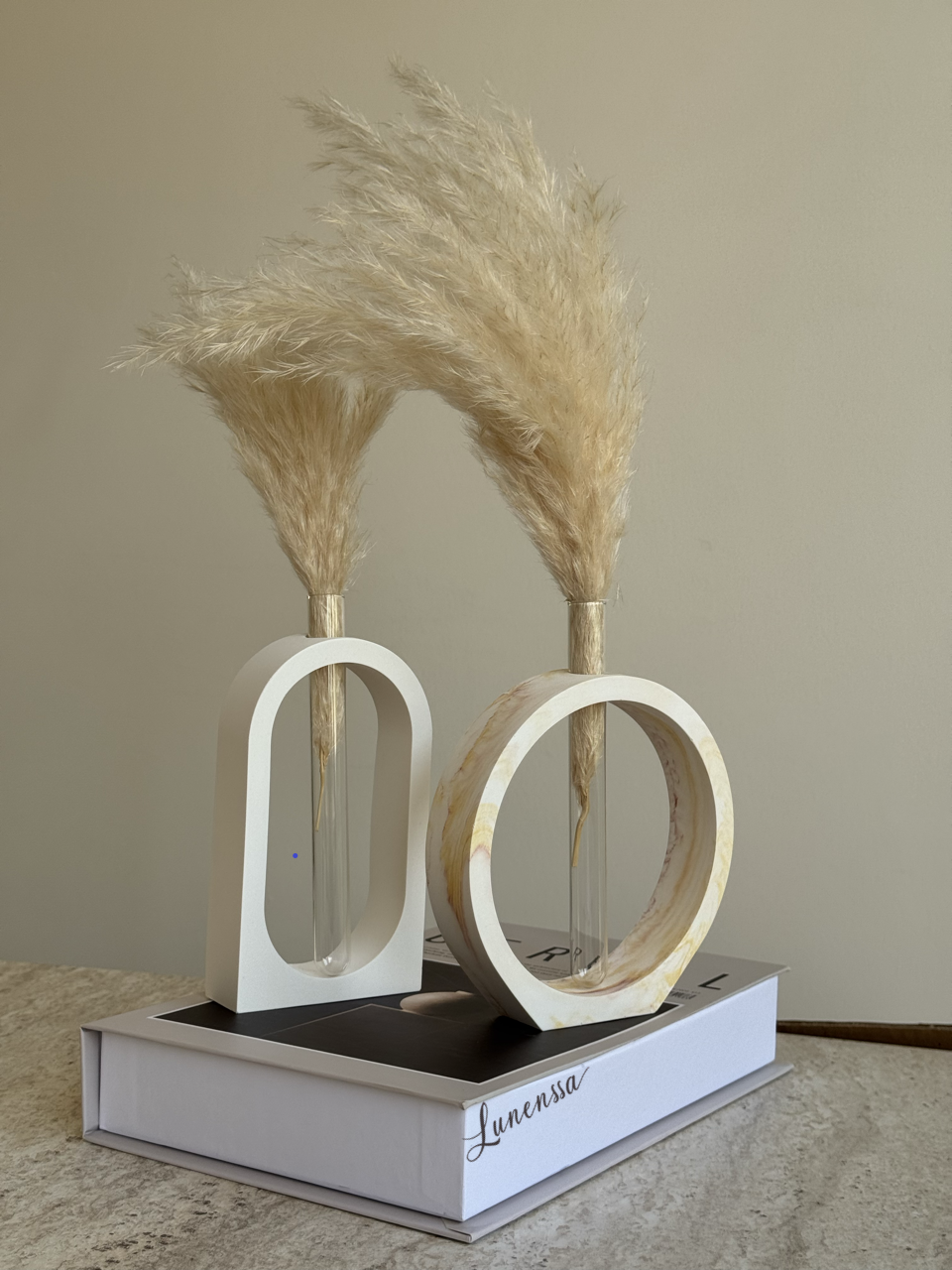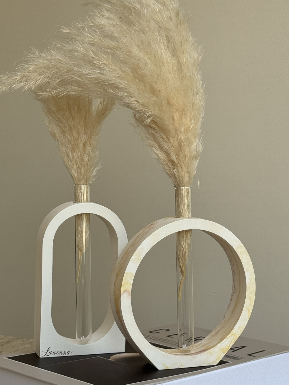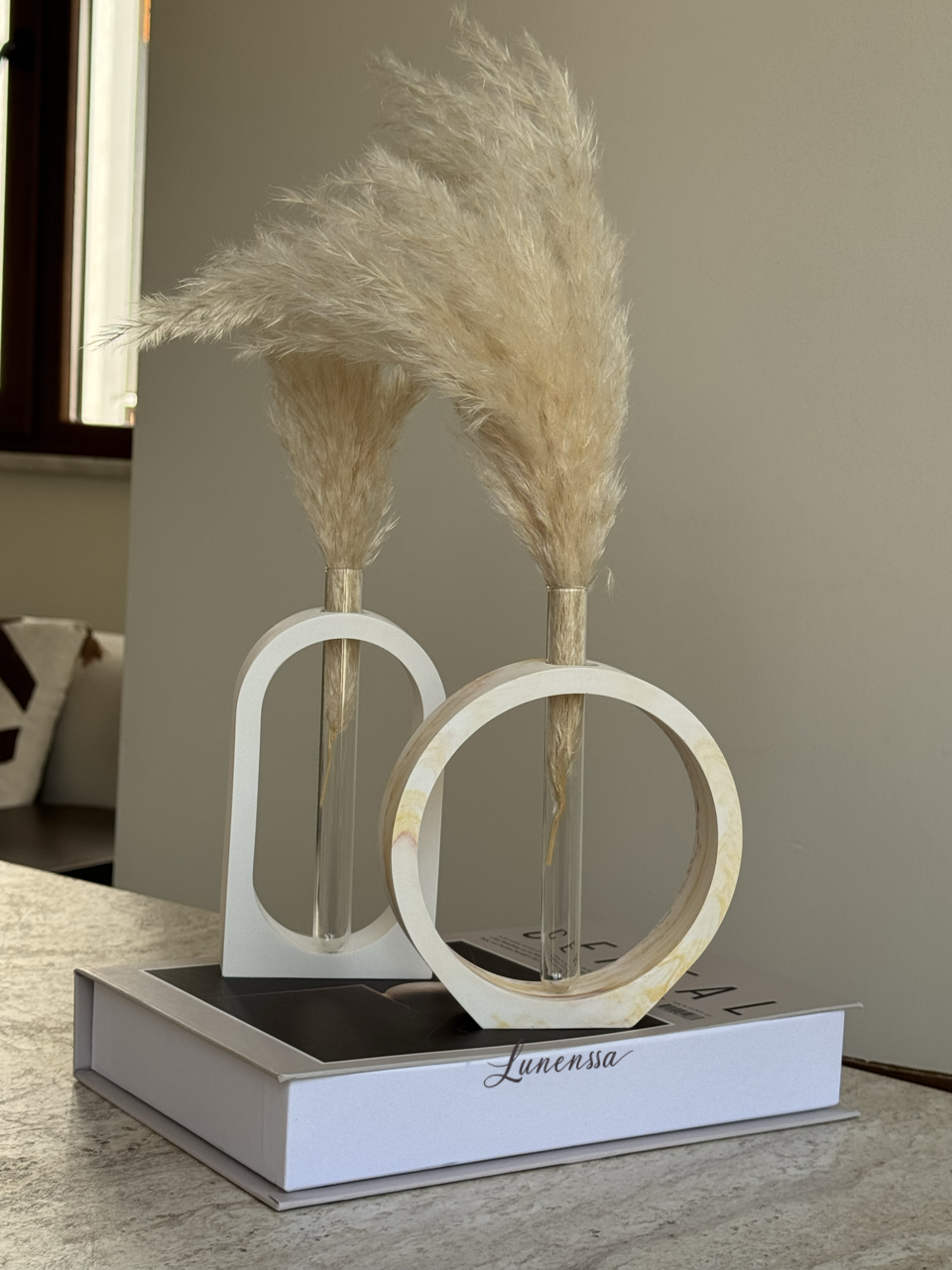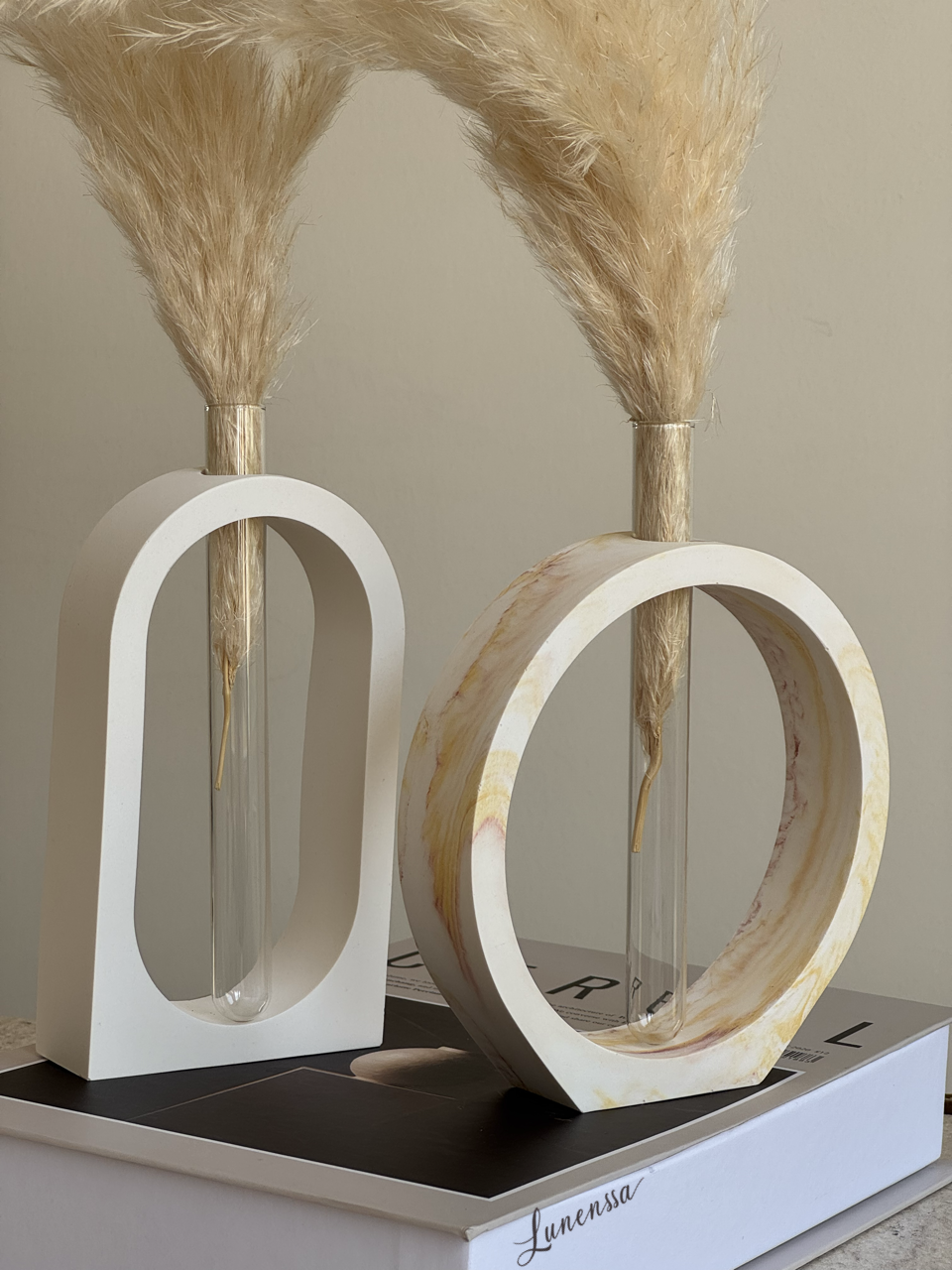 Form ve dokunun dengeli birleşimini yansıtan bu özel ikili set, yaşam alanlarınıza doğal ve özgün bir karakter kazandırır. Kavisli vazo, boyasız doğal tonuyla yalın bir ifade sunarken; daire form, kahve ve sarı pigmentlerin üretim aşamasında harçla harmanlanmasıyla kendine has desenli görünüm kazanır. Her iki ürün de cam tüplüdür ve hem kuru hem de ıslak çiçekler için kullanıma uygundur.