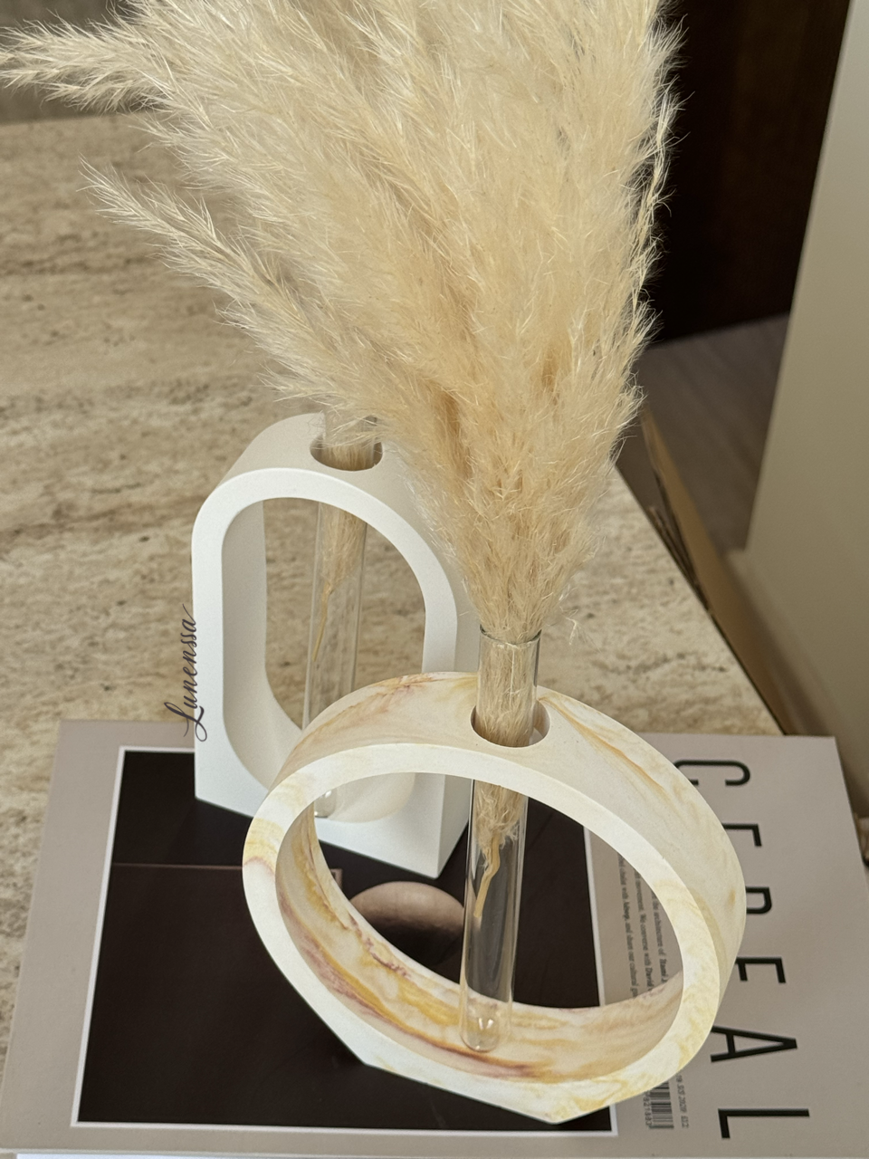 İkili Set Cam Tüplü Kahve-Sarı Renk Desenli Vazo Minimal Kuru/Islak Çiçek Vazosu (Kavisli-Daire)