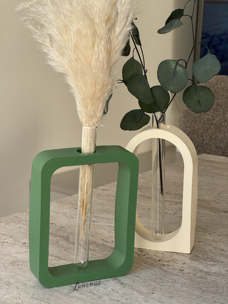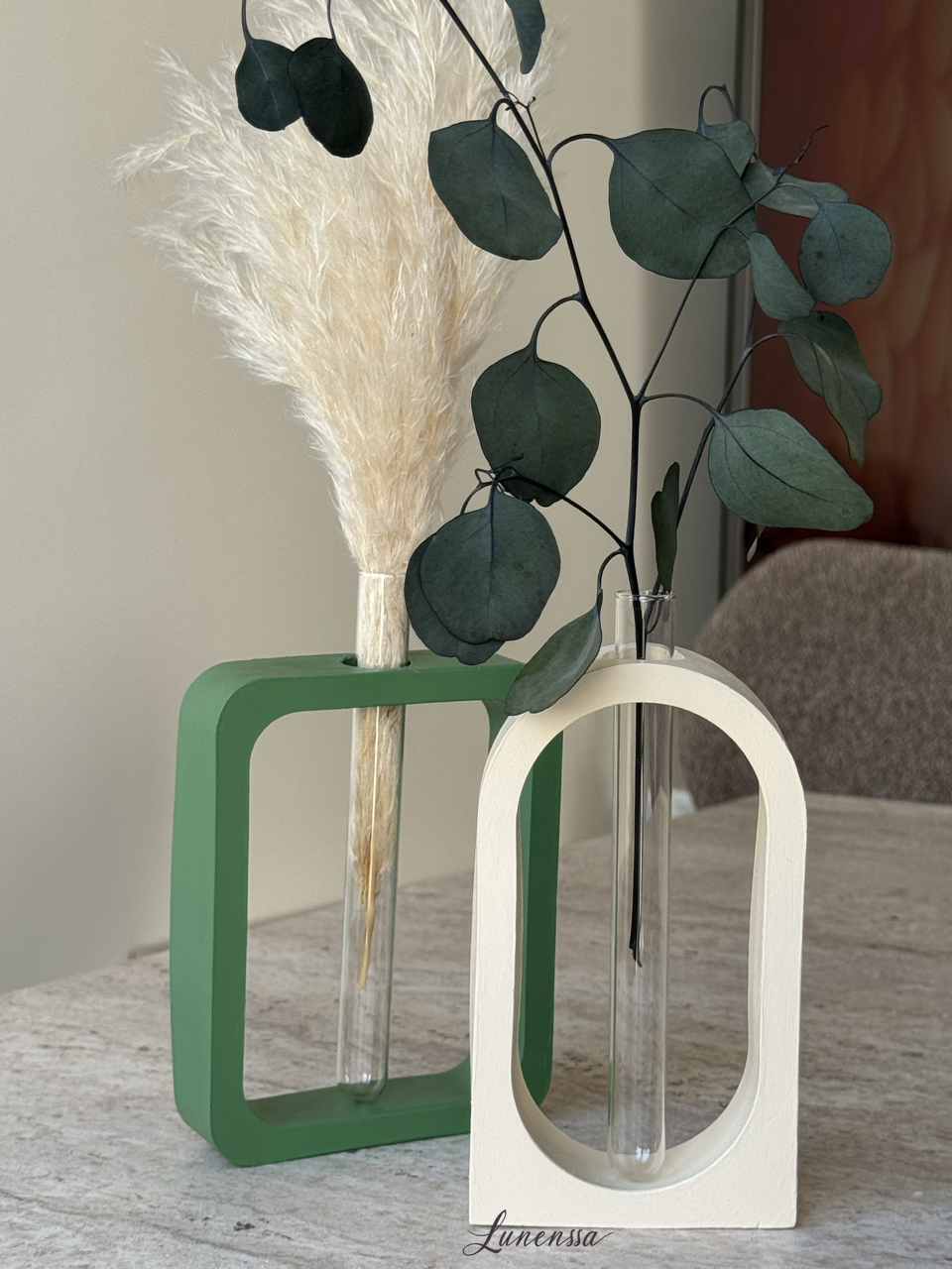 İkili Set Cam Tüplü Yeşil-Bej Renk Cilalı Vazo Minimal Kuru/Islak Çiçek Vazosu (Dikdörtgen-Kavisli)