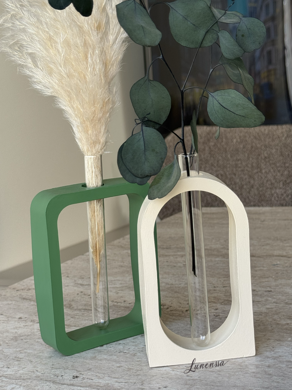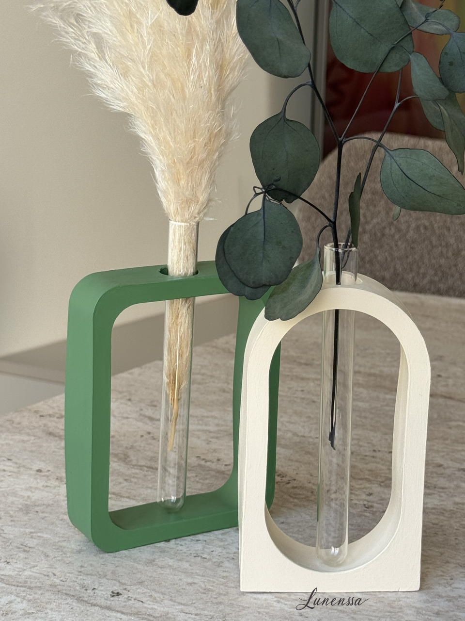 Yumuşak geçişli formlar, doğal tonlarla yeniden hayat buldu. Bu ikili set, yeşil ve bej renklere akrilik boya ile özenle boyanmış; ardından mat cila ile sabitlenerek zarif bir dokunuş kazanmıştır. Her biri cam tüplü olan vazolar, kuru veya ıslak çiçeklerle etkileyici bir uyum yakalar.